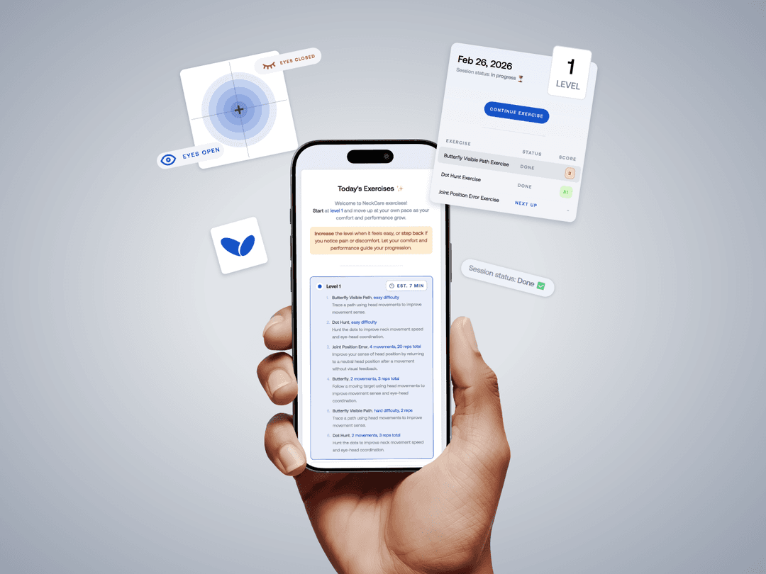 Clinicians assign and manage home exercise programs directly in the NeckCare platform. Patients follow guided sessions focused on sensorimotor control, proprioception, and neck mobility. Using the patient’s device camera, the system tracks movement in real time and logs activity automatically, after each session.