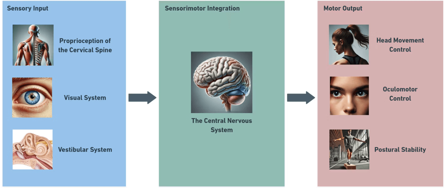 This system integrates visual input from the eyes, proprioceptive input from the cervical spine, and vestibular input from the inner ear to continuously adjust motor output appropriately. Therefore an injury or dysfunction in the cervical spine can have a crucial impact on this integrated system.
