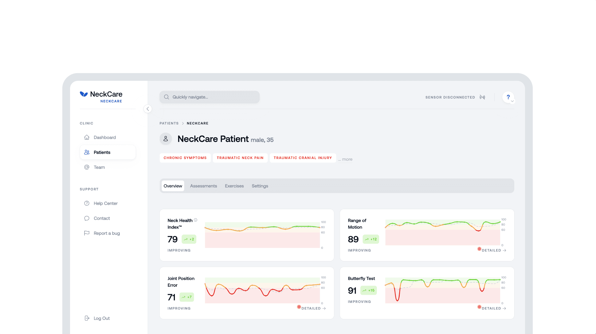 Neck pain often involves sensorimotor dysfunction. The NeckCare System™ provides objective assessments to support diagnosis and treatment.